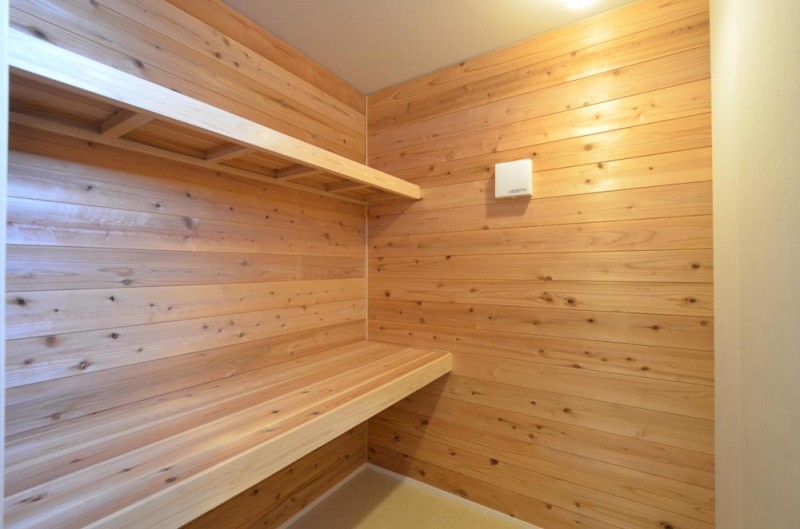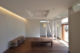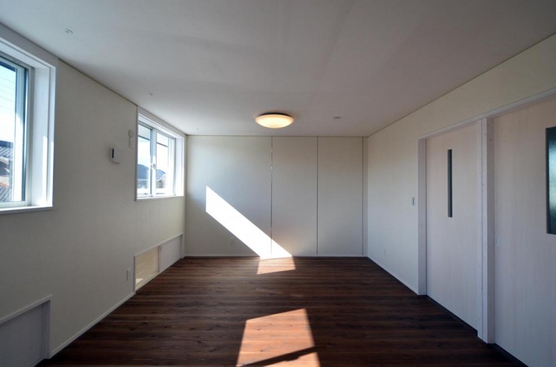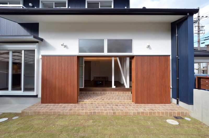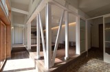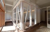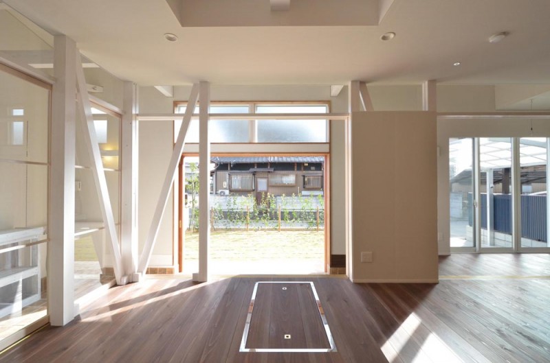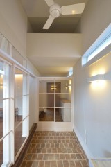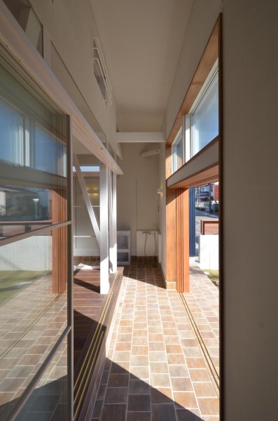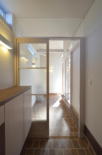 通り土間の南側には、両引き込みの大きな開口が得られる木製サッシを設けています。更に、この部分は少し天井を高くして、冬場の陽差しが広間の奥まで届くようになっています。広間の外側に設けられたとおり土間と広縁は建具で仕切ることが出来るので、夏冬の外気からの影響を最小限に抑えることが出来ます