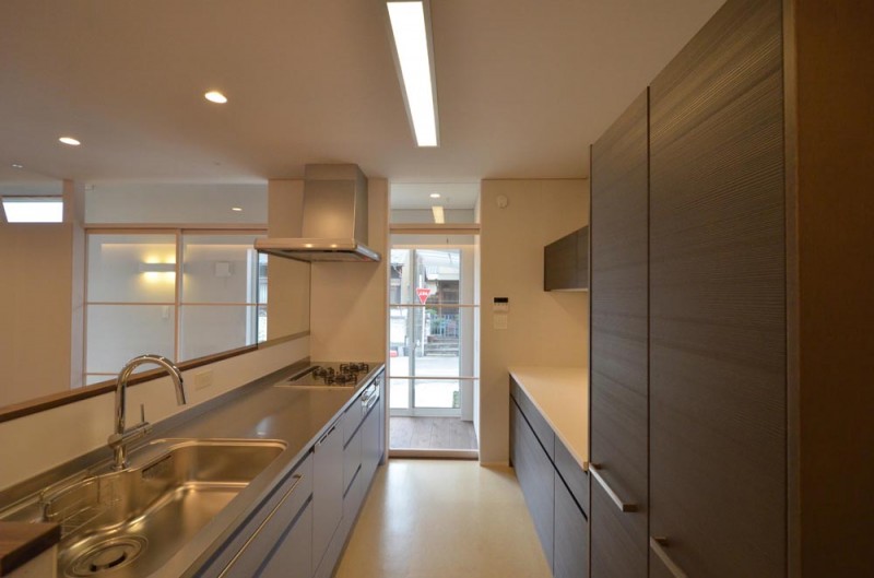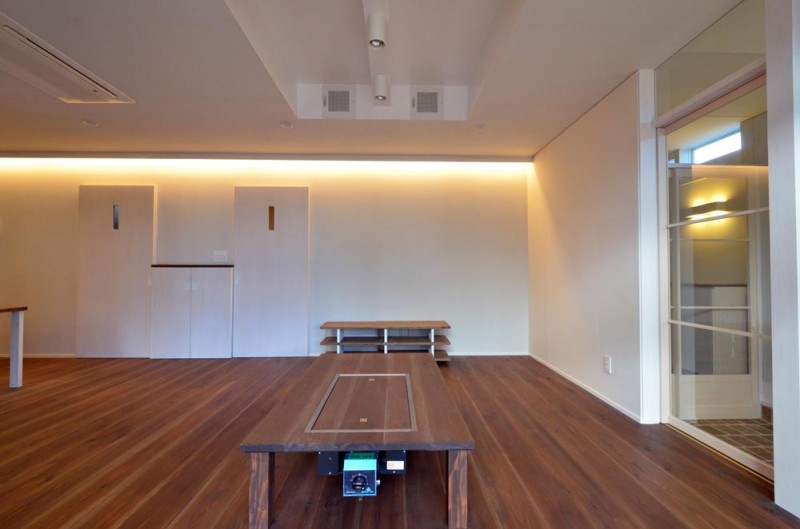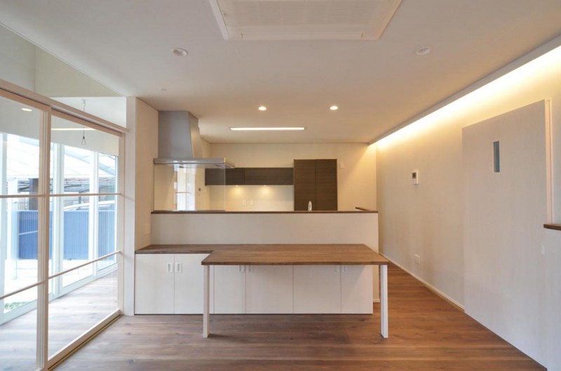 元々お住まいだった、敷地からも程近い、借家のLDKとほぼ同じ広さの広間をつくり、その周りに通り土間をつくることで、今までの住まいより更に広がりのある空間を実現しています。そして、その土間には、ご主人の趣味である熱帯魚の水槽が置かれています。
