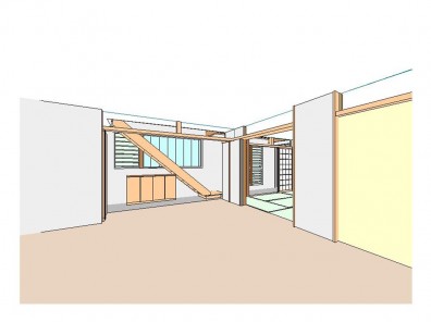 この通り庭は夏は構造を考慮した上で最大限の開口を取り、夏の熱気を逃がすため、2階にはベランダに面した開口部から熱気を逃がすように考えております。冬場になるとその大きな開口部から陽差しが部屋の奥まで届きます。