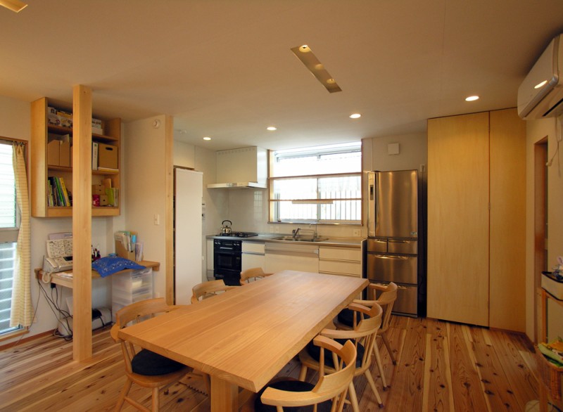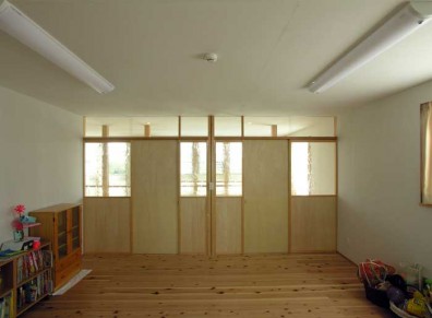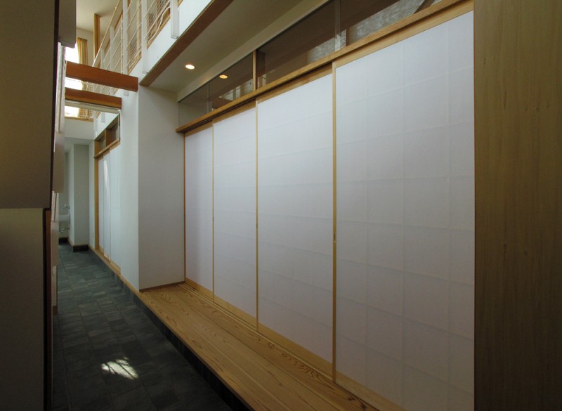 通り庭とお部屋は障子で仕切ることが出来ますので、夏も冬も外気の影響を最小限に抑えることが出来ます。また、壁と天井に使用したモイスは調湿作用があり、床に使用したスギフローリングは素足に優しく、夏はさらさらとして、冬場も冷たさを感じさせません。岐阜の地にあって、冬場の結露がほとんど起きないと喜ばれています。