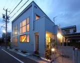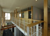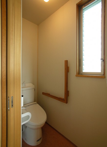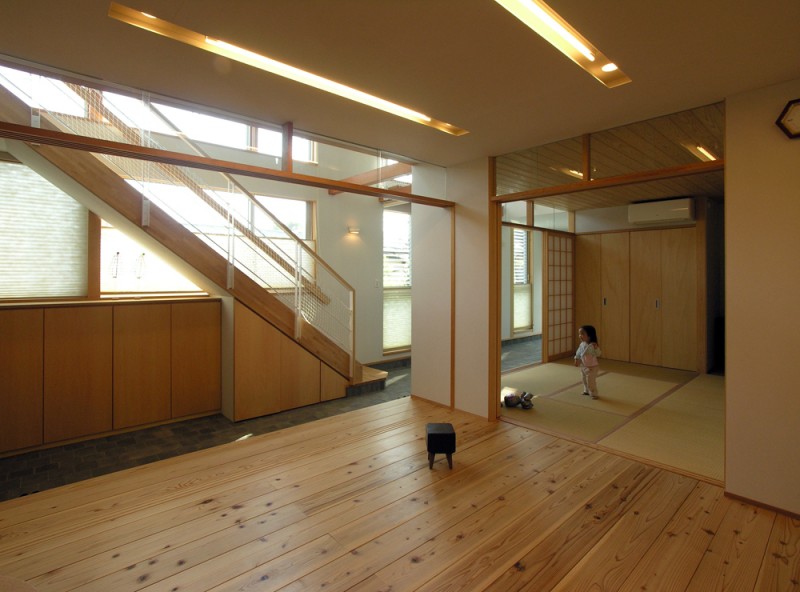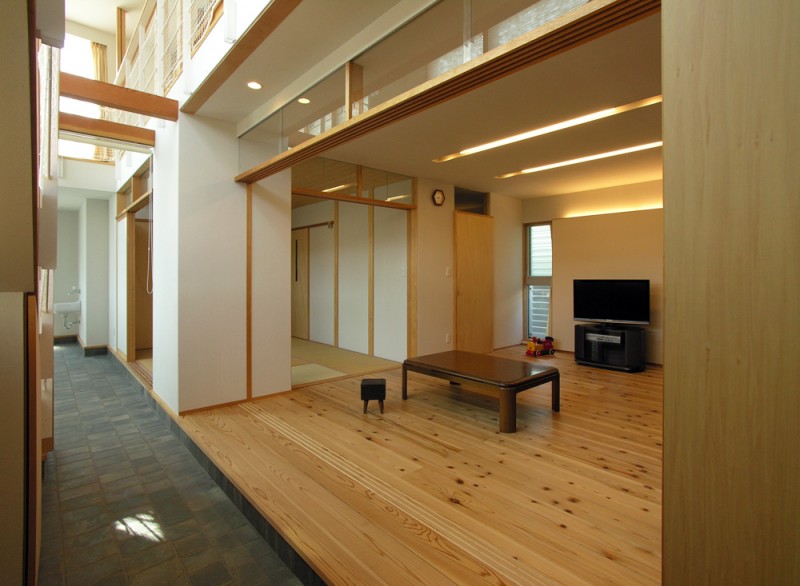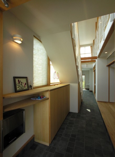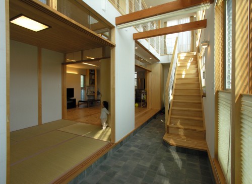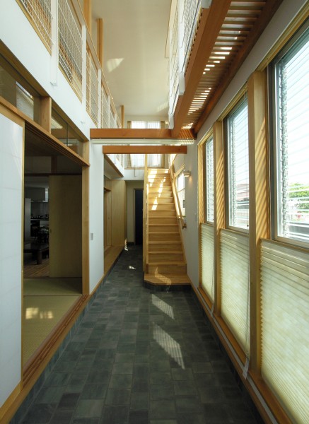 南側に庭を取る余裕が無かったので、通り土間をつくって庭のような、子ども達の遊び空間を考えました。そこは、玄関でもあり、時としては物干し場にもなります。また、2階の廊下手すりは、布団干しにも使われています。花粉症のご家族にとって、室内で物干しが出来るのは、とても喜ばれました。